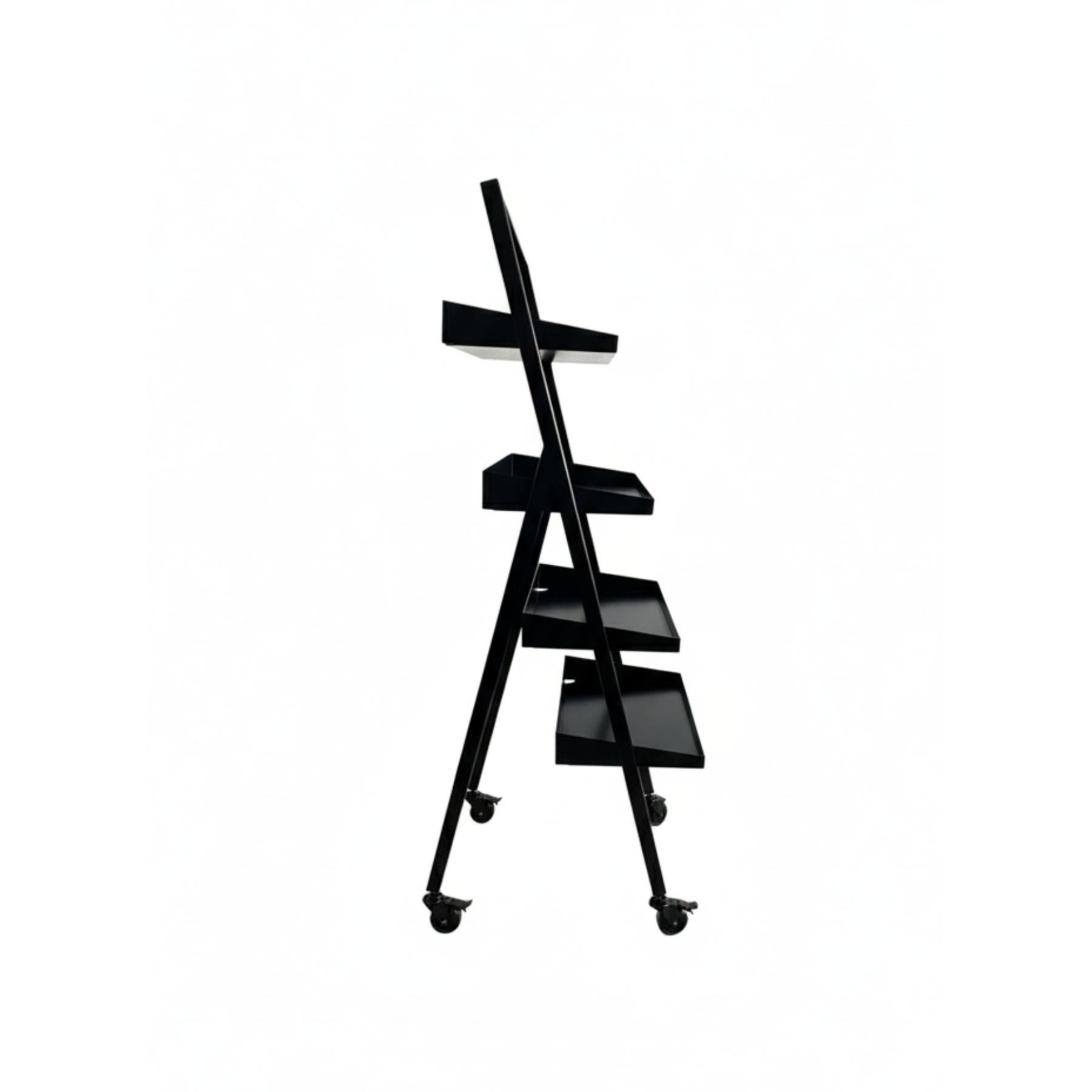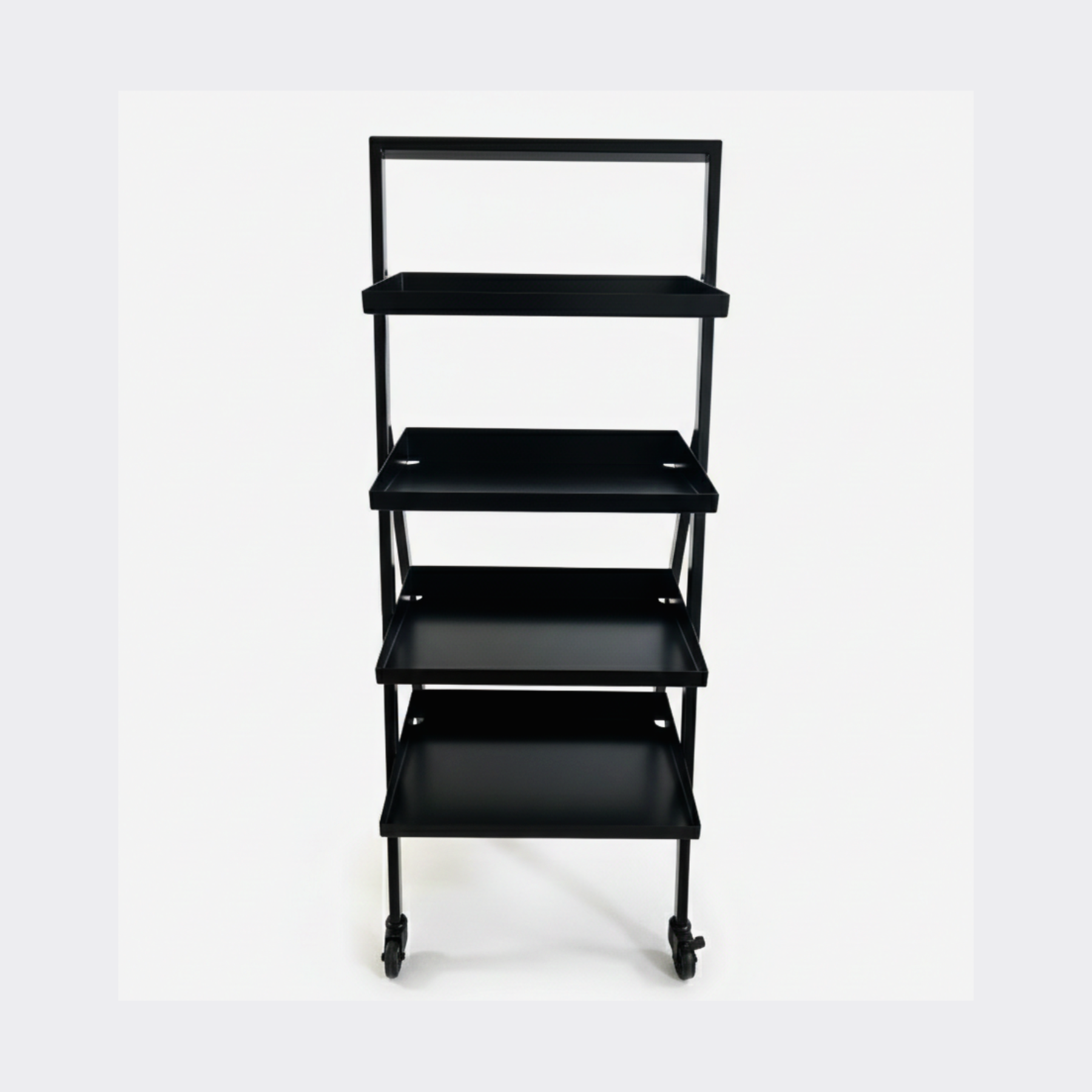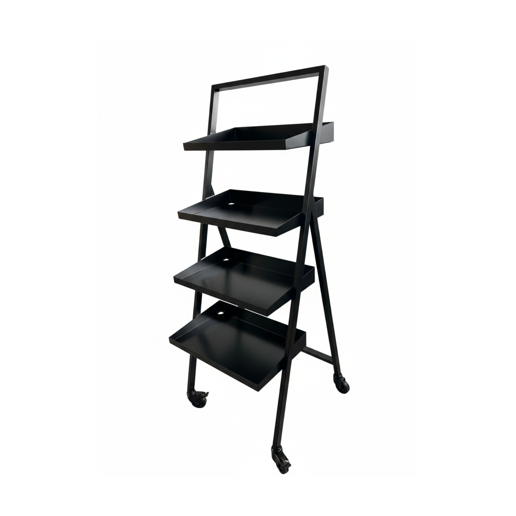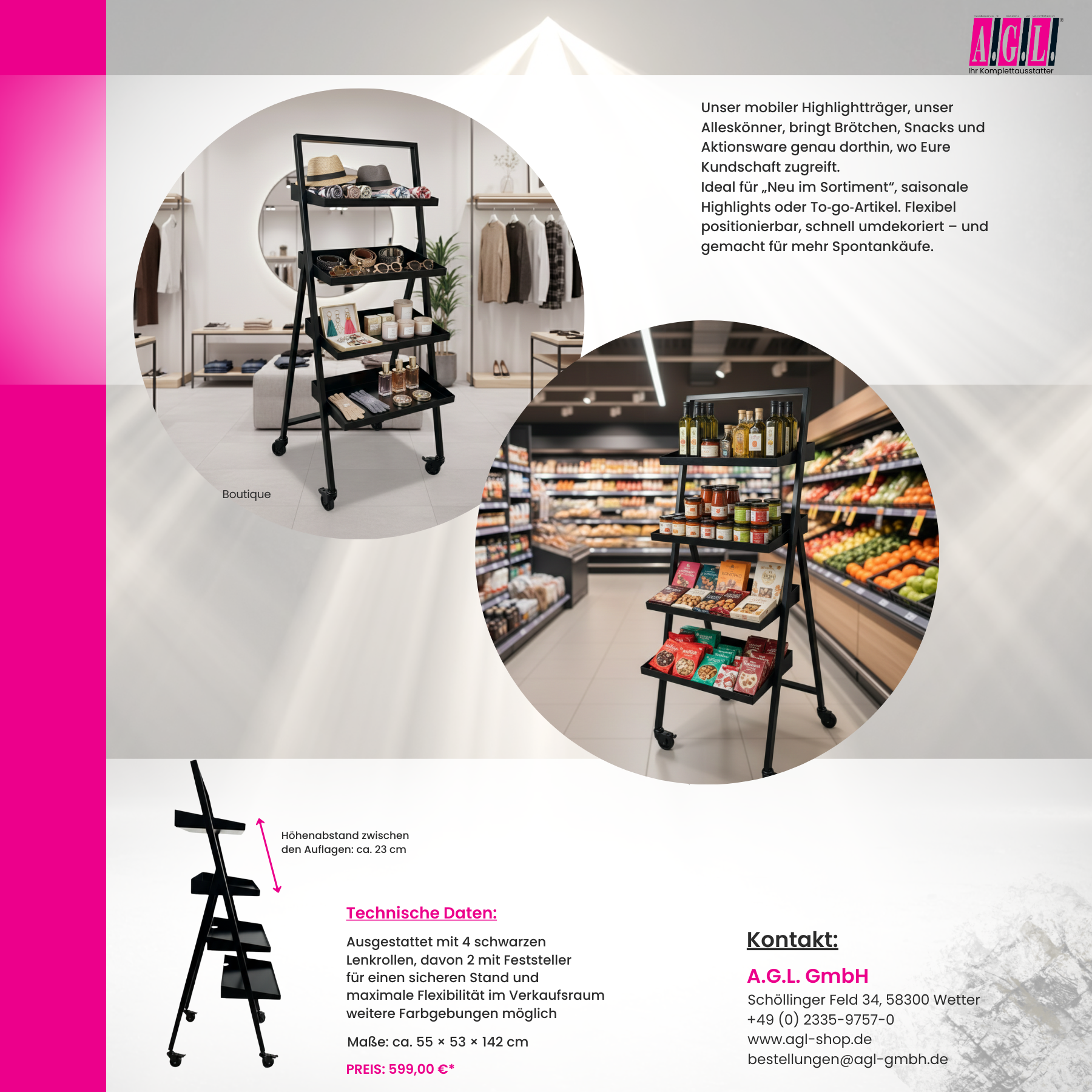 - Ausgestattet mit 4 schwarzen Lenkrollen, davon 2 mit Feststeller für einen sicheren Stand und maximale Flexibilität im Verkaufsraum